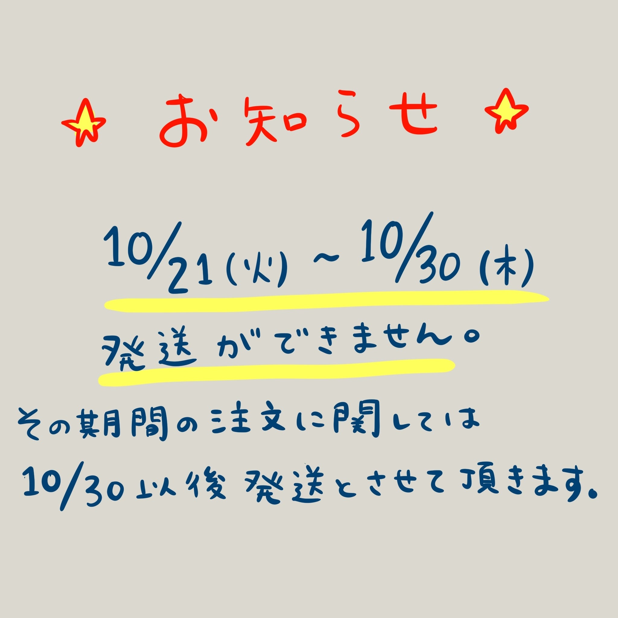 10/21(火)〜10/30(木)まで発送業務ができません。期間中に注文された商品の発送は10/30以降に発送させて頂きます。